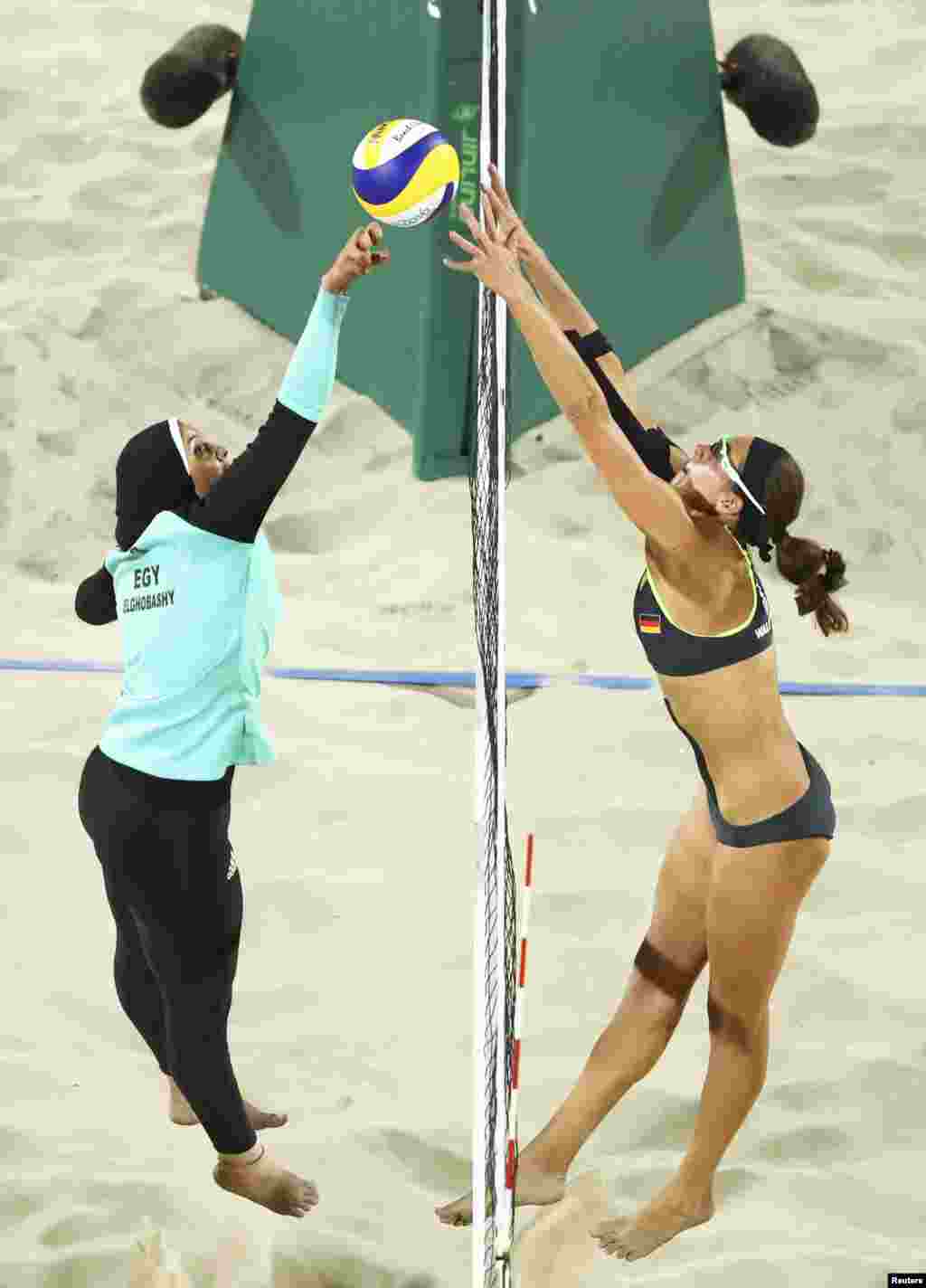 A egípcia Doaa Elghobashy e a alemãKira Walkenhorst nas pré-eliminatórias de vólei, Rio de Janeiro. 7 de Agosto 2016.