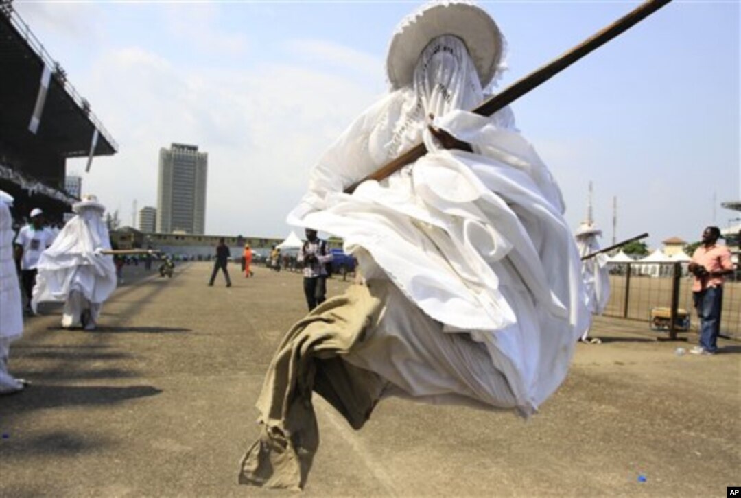 Eyo masquerades dance through Tafawa Balewa Square in Lagos, Nigeria, Saturday, Nov. 26, 2011, to honor the death of a prominent Lagos Chief Yusufu Abiodun Oniru. The shouting masquerades carry sticks and sometimes hit people who break traditional rules l