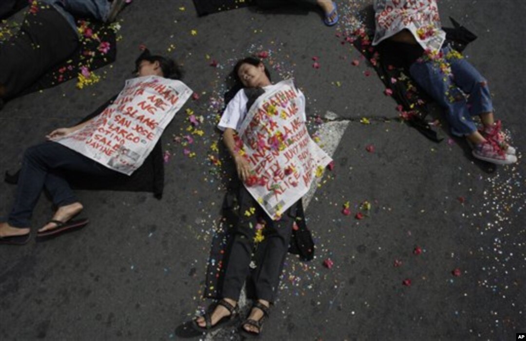 Filipino women activists stage a play to symbolize human rights violations during a demonstration to mark the International Day of Action on Violence Against Women near the Malacanang presidential palace in Manila, Philippines, Friday Nov. 25, 2011. The w