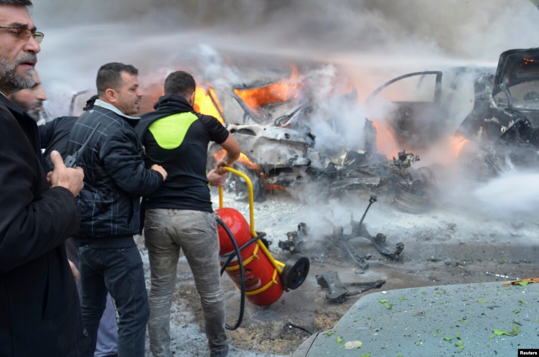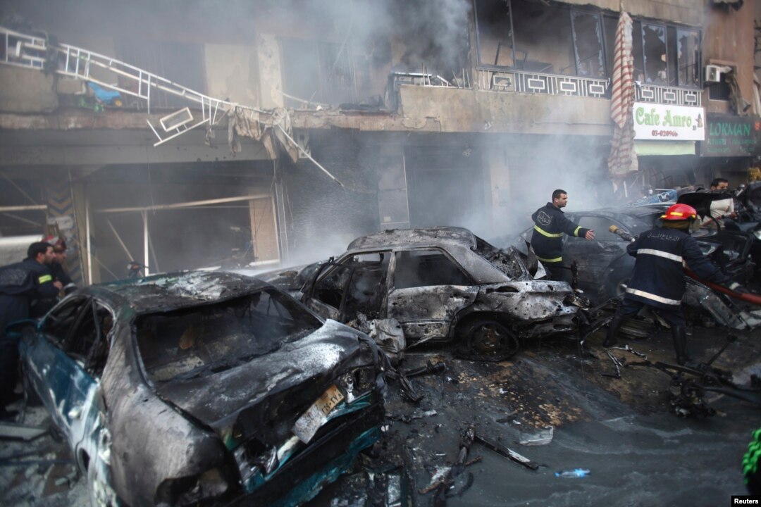 Bombeiros apagam o fofo no local da explosão da bomba, em Haret Hreik, Beirute, Jan. 21, 2014.