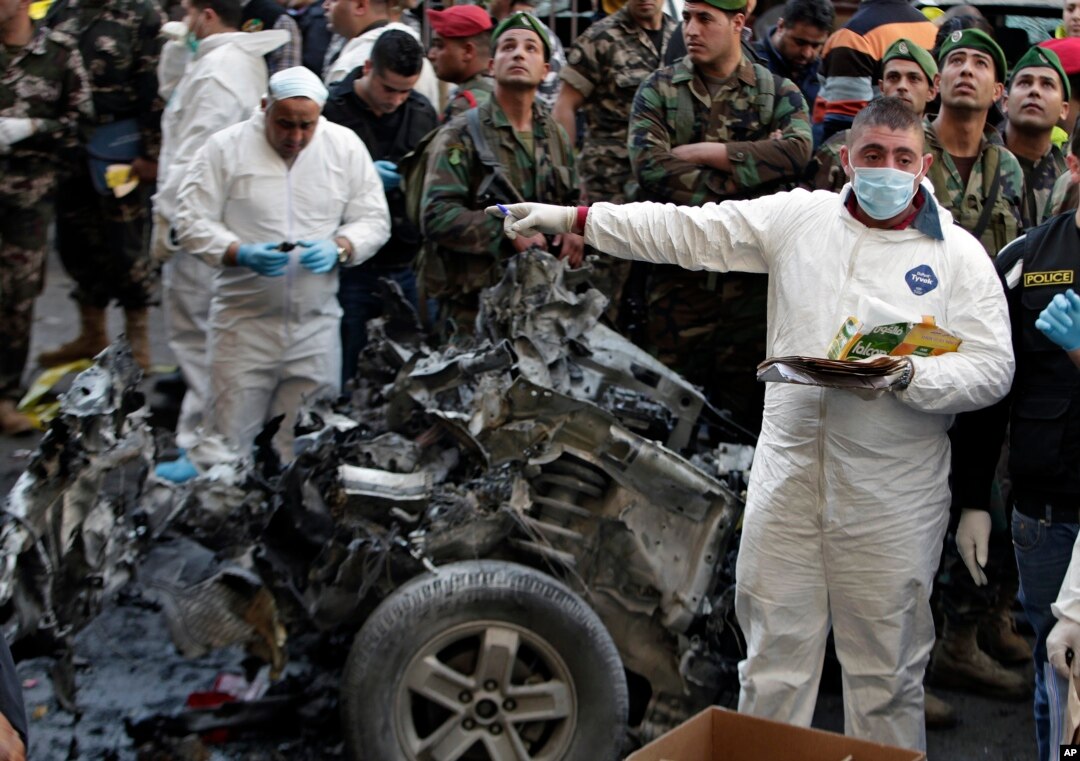 Investigadores inspeccionam partes de um carro destruído no local da explosão de um carro-bomba, em Beirute, Jan. 21, 2014.