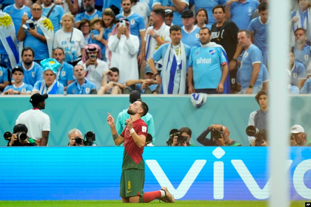 Bruno Fernandes, celebra o seu segundo golo contra o Uruguai. Portugal ganhou o Uruguai por 2-0, em jogo do grupo H, no Estádio Lusail, Doha. Com esta vitória, Portugal passou à fase dos oitavos-de-final do Mundial.